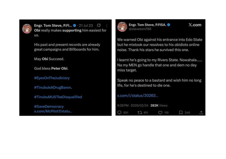 Engr. Tom Steve, P.FISA (@stevetom788)’s online persona is a symptom of a deeper Nigerian malaise. Cloaked in activist language yet steeped in threats, ethnic bile, and open incitement, his posts show how easily lawlessness now migrates from the streets to social media—unchecked, rewarded, and dangerously normalised. When voices like his can hint at violence, celebrate...