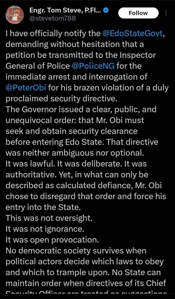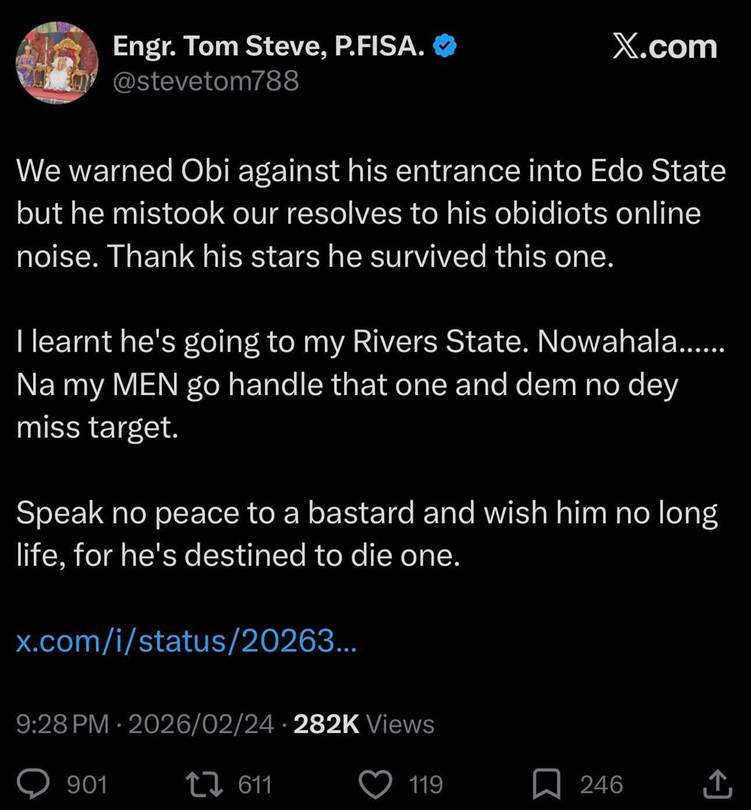 Compounding the danger, on February 24, 2026—the very day of the Edo attack—@stevetom788 posted a chilling follow-up. He gloated over Peter Obi’s survival while issuing an explicit threat ahead of a rumoured visit to Rivers State. In his words: “Na my MEN go handle that one and dem no dey miss target… Speak no peace to a bastard and wish him no long life, for he’s destined to die one.”