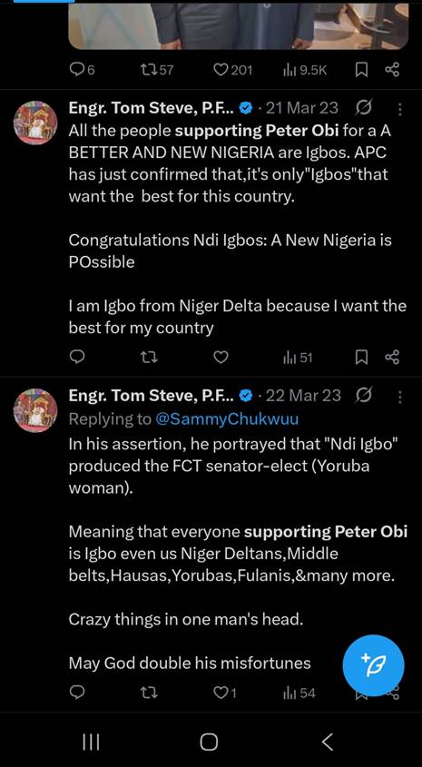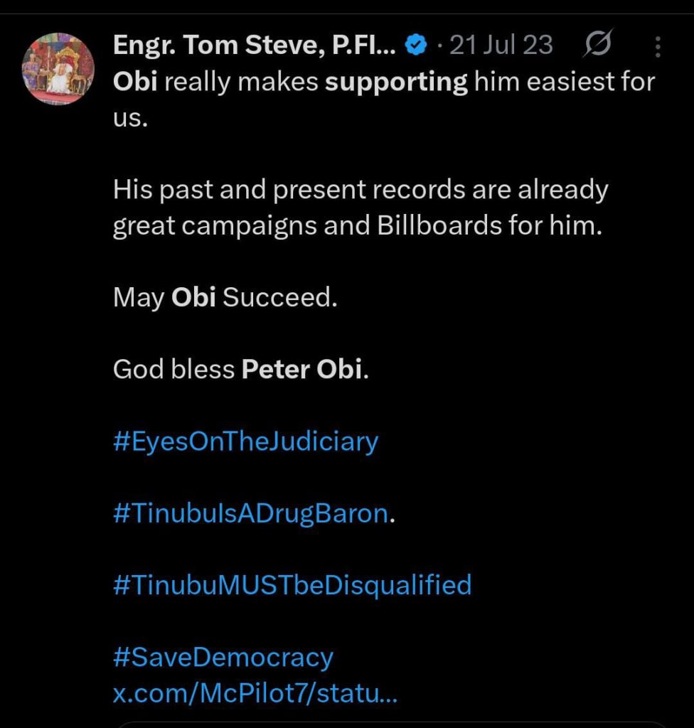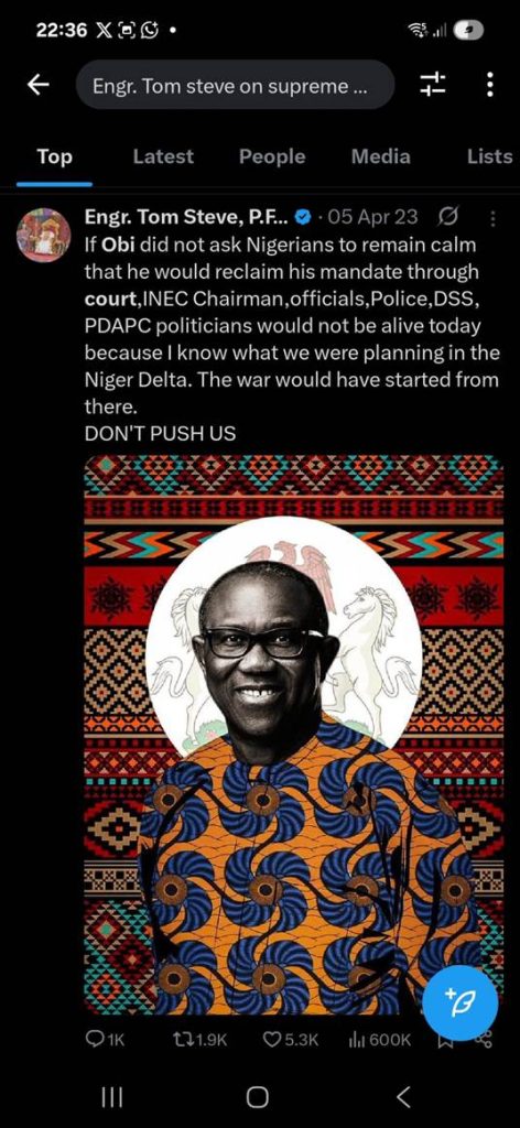 Posts from 2023 show @stevetom788 strongly supporting Peter Obi during the election crisis, portraying him as a victim of electoral fraud and a calming influence. In an April 2023 post, he warned that without Obi’s restraint, violence might have erupted in the Niger Delta.