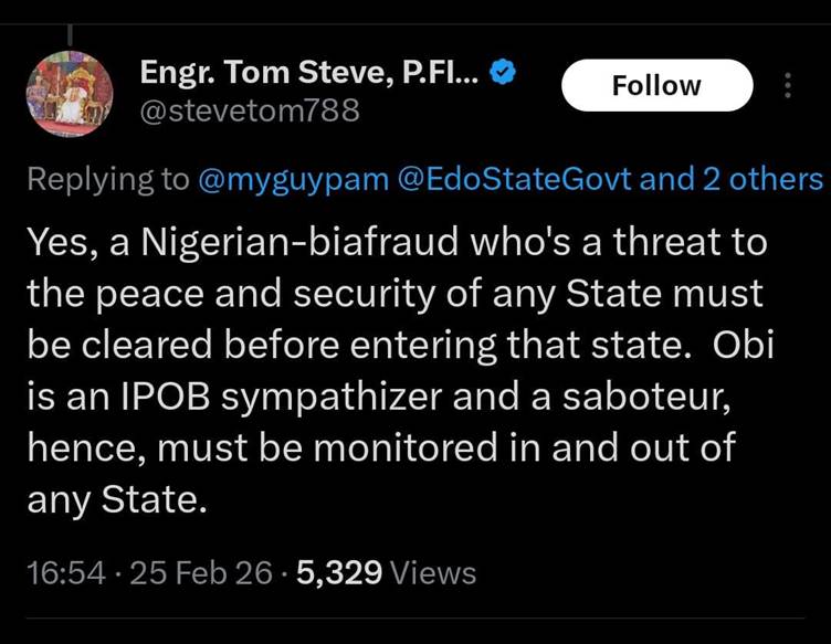 Among them was X user Engr. Tom Steve, P.FISA (@stevetom788), who on February 25, 2026—the day after the attack—publicly demanded Obi’s immediate arrest and interrogation for allegedly defying the governor’s directive. He labeled Obi an “IPOB sympathiser and a saboteur,” framing his visit as a threat to state security and regional order.