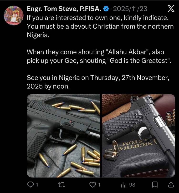 A post dated November 23, 2025, crosses into outright incitement. In it, @stevetom788 offered weapons (“Gee,” slang for gun) exclusively to “devout Christians from northern Nigeria,” urging them to counter “Allahu Akbar” chants with “God Is the Greatest” gunfire at a specified time and location. In Nigeria’s volatile North—where sectarian violence has claimed countless lives—this call to arm one religious group against another is reckless and potentially criminal.