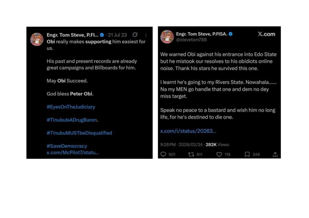 Compounding the danger, on February 24, 2026—the very day of the Edo attack—@stevetom788 posted a chilling follow-up. He gloated over Peter Obi’s survival while issuing an explicit threat ahead of a rumoured visit to Rivers State. In his words: “Na my MEN go handle that one and dem no dey miss target… Speak no peace to a bastard and wish him no long life, for he’s destined to die one.”